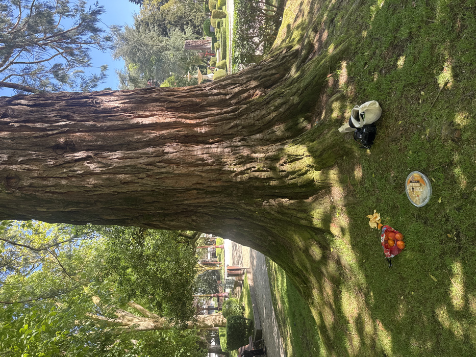 large tree trunk with a thick, brown, rough bark. The base of the trunk is covered in moss and surrounded by green grass. The tree is located in a park in Lugo, Spain, at the coordinates 43.006, -7.56. Scattered on the grass near the trunk are some food items - a plastic container with a label, a red plastic container with orange fruit, and some debris. A pair of shoes, one black and one white, are also visible on the grass. The image is taken on a sunny day. The background shows other trees, a paved path, and a stone fountain. A person is visible in the background sitting on a bench.