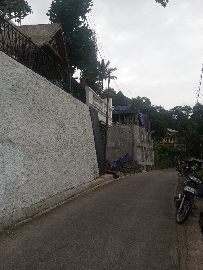 The scene, set in Bhupalpally, India, presents a sloped, paved road under an overcast sky. A textured, light-colored retaining wall runs along the left side, featuring a concrete curb at its base. Above this wall, a structure with a thatched roof and dark metal railing is visible, followed by a white balustrade section. A dark, slanted panel is affixed to the retaining wall in the mid-ground. A thin palm tree stands erect behind the balustrade. On the right side of the road, a black and white motorcycle is parked on its kickstand, with a partially visible license plate reading "AD7943". Beyond the motorcycle, an unfinished concrete building structure, partially covered by blue tarpaulins, stands on the right. The background consists of dense green foliage covering a hilly terrain, with a distant yellow house featuring a red roof nestled among the trees. Power lines are visible stretching across the upper portion of the frame. No individuals are present.