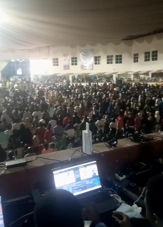 A wide shot captures a large indoor gathering