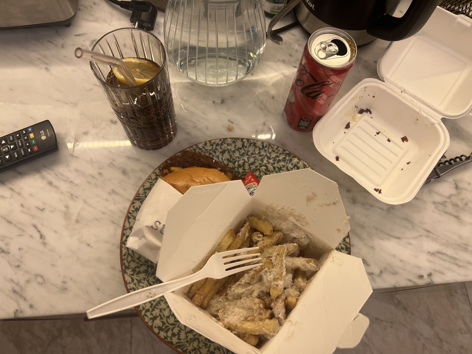 A marble countertop features a plate with a burger in a white paper wrapper, a small ketchup packet, and an open box of fries covered in sauce with a white plastic fork. A glass of dark liquid with ice and a lemon slice sits nearby, along with a clear carafe of water, a can of Coca-Cola, and an open white takeout container with crumbs. An LG remote control is on the left. A black kettle is visible in the background.