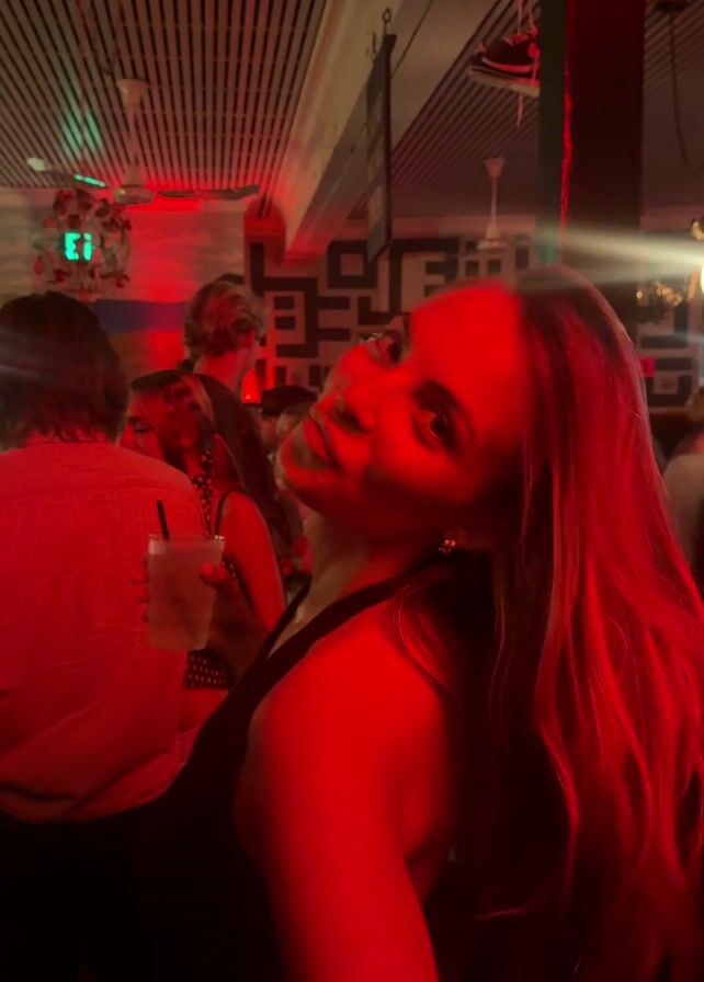 A woman with long blonde hair, wearing a black halter top, poses for the camera while holding a drink in her left hand. She is standing in a crowded bar with red lighting. Other patrons are visible in the background, along with bar decor like signs and hanging sneakers. The ceiling has a linear pattern.