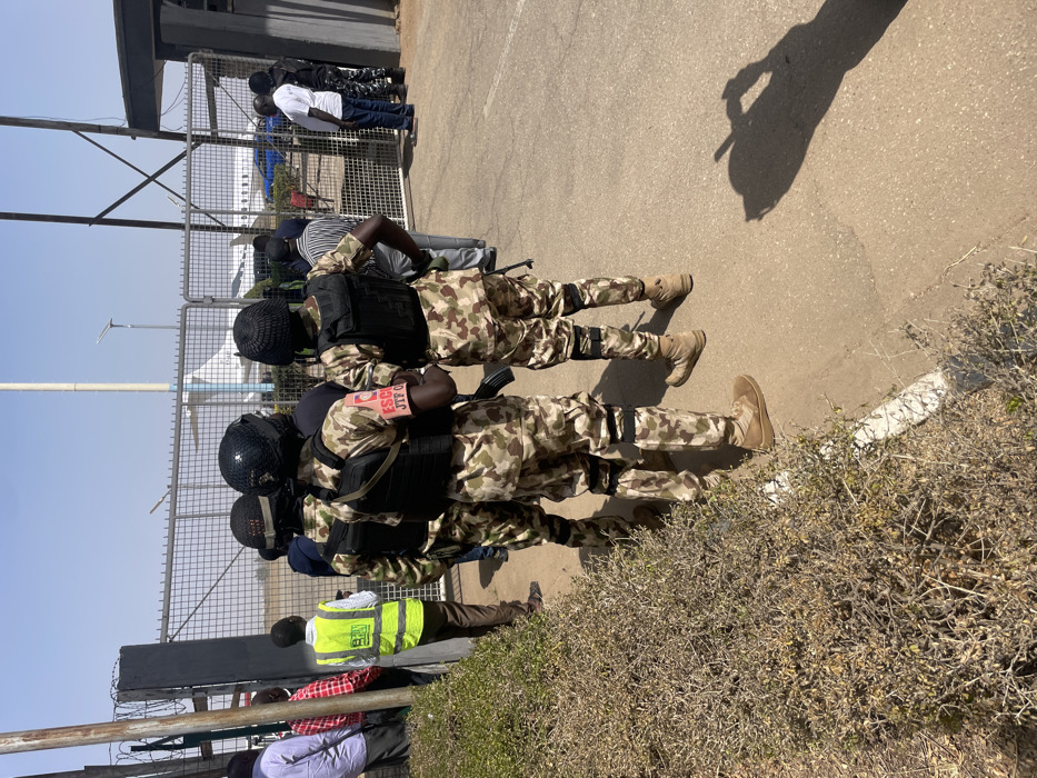 The image depicts an outdoor scene at an airport in Kwi, Nigeria, under clear daylight conditions. Three individuals, viewed from behind, are positioned on a paved surface. They wear camouflage fatigues, black helmets, tactical vests, and tan boots. One individual's left arm displays a red armband with the inscription "ESC JTF 01". These individuals appear to be armed with rifles, partially visible. They face a chain-link fence topped with razor wire, beyond which a white private jet is visible on an tarmac. Several civilians are standing near the fence and an open gate; one wears a high-visibility yellow vest, while others are in various casual clothing. Dry, light-brown vegetation lines the left foreground.
