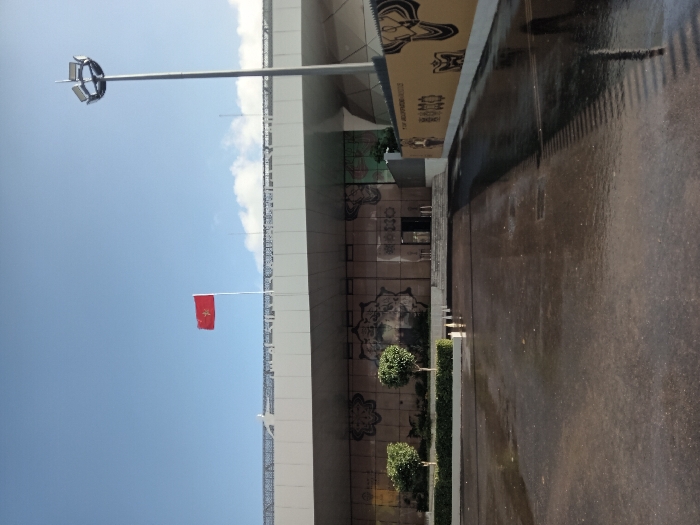The image depicts the exterior of a large, modern building, identified as Mohammed V International Airport in Casablanca, Morocco. The scene is viewed from ground level, showing a wide, dark, wet paved area in the foreground, suggesting recent rain. In the background, the multi-story building features a prominent, lighter upper section with a white railing or facade. Above this, a red Moroccan flag with a green pentagram is flying from a white flagpole against a clear, bright blue sky with sparse white clouds. Below the upper section, the building's facade is a darker material, likely glass or stone panels, adorned with large, intricate, light-colored patterns reminiscent of traditional Moroccan geometric or floral designs. A central entrance with dark glass doors is visible. A low, manicured green hedge and two small, round-canopied trees are positioned along the base of the building's facade. To the right, a beige-colored wall runs parallel to the paved area, decorated with large, stylized black and white traditional Moroccan motifs and some white text, partially reading "THE MOROCCAN...". A tall, grey metal light pole, topped with a cluster of five floodlights, stands vertically on the far right side of the frame, casting a faint shadow on the wet pavement. No individuals or specific actions are visible within the frame.