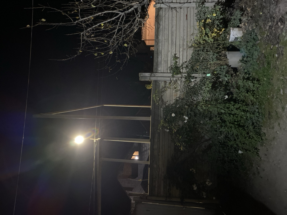 A dimly lit outdoor scene at night shows a wooden fence and an overgrown rose bush with white flowers. A bare tree branch extends from the top left. A bright street light casts a glow on nearby structures, including a partially obscured building behind the fence. A concrete pillar supports the fence. The ground is covered with fallen leaves and debris.