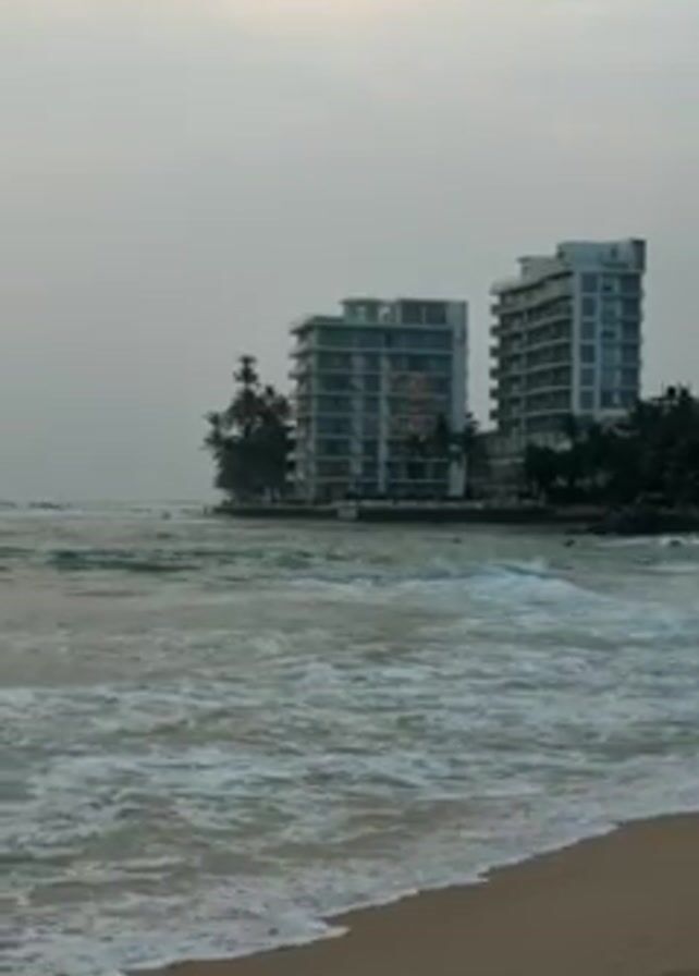 beach scene with two tall buildings in the background. The beach has sand and the sea is choppy, with white foamy waves rolling towards the shore. The sky is overcast. The buildings are white and have multiple floors. There are trees and greenery between the buildings and the beach. The video is a static shot taken from the beach.