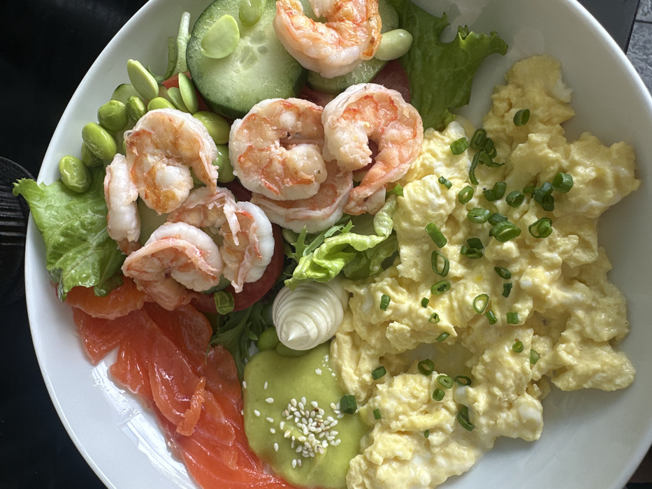 A white bowl is filled with a vibrant and colorful mix of ingredients. Fluffy scrambled eggs, sprinkled with chopped green onions, occupy the right side. Smoked salmon slices, several cooked shrimp, fresh green lettuce, cucumber slices, and edamame are arranged on the left. A dollop of mashed avocado, garnished with sesame seeds, and a spiral of butter add to the appealing presentation.