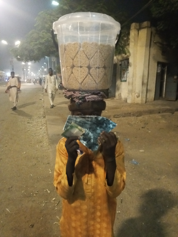 A person stands on a dimly lit street, balancing a clear plastic tub filled with what appears to be heart-shaped cakes on their head. A patterned cloth cushion sits between the tub and their head. They hold up a blurry, reflective object that obscures their face. The person wears a long-sleeved, golden-yellow patterned garment. Two other people are seen walking on the sidewalk in the background, with streetlights lining the road. A building is visible behind the person.