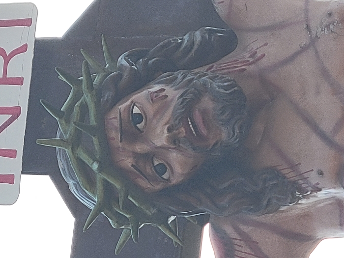 A statue depicts Jesus Christ crucified