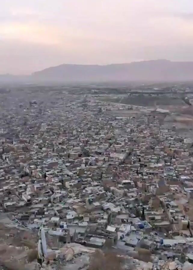 wide aerial view of a densely packed city. The buildings are mostly low-rise and appear to be made of concrete or similar materials, with flat roofs. There's a hazy overcast sky, and mountains are visible in the distance. The camera zooms out slightly from the city to reveal a rocky foreground, indicating the view is from a high vantage point, possibly a hill or mountain overlooking the city.