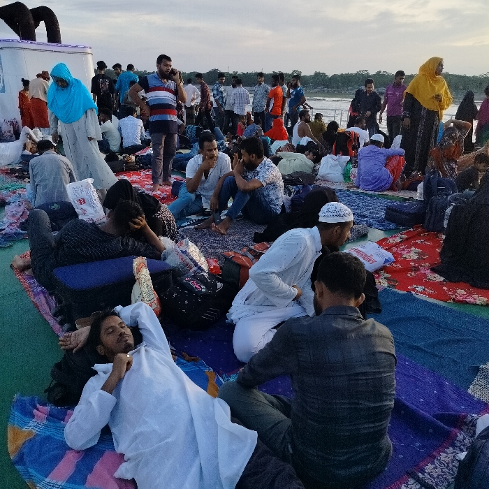 A large group of people are gathered on the deck of a boat or ferry. Many are seated or lying down on blankets and mats spread across the green deck. Passengers wear a variety of clothing, with some in traditional Muslim attire, including hijabs and kufis. Others are in casual Western-style clothes. Some individuals are standing, engaged in conversations or using mobile phones. The scene suggests a journey or travel, with a focus on community and shared space.