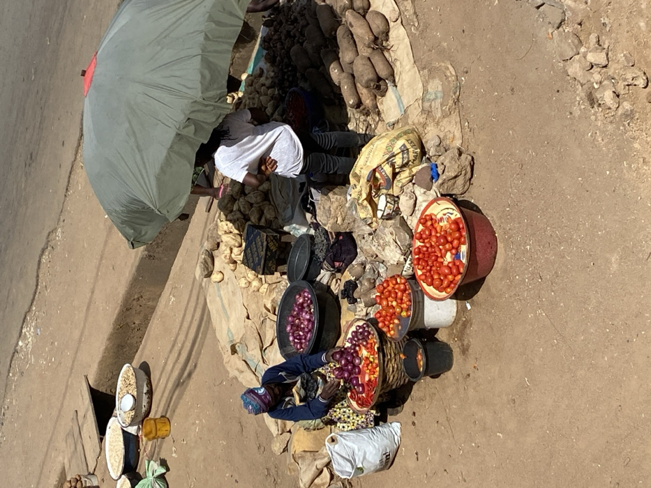 The image depicts an outdoor market stall in Gwong, Nigeria, situated on an unpaved, earthen surface