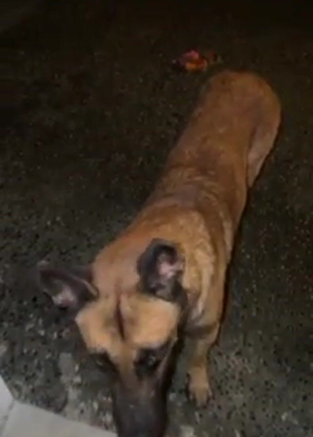medium-sized dog standing on a paved surface. The dog has short, tan fur with a dark muzzle and erect ears. A person speaks to the dog, calling it "brother." The dog is looking towards the camera. In the background, there are vehicles, including a red car with a license plate visible. The lighting is dim, suggesting the video was taken at night. The dog takes a few steps forward and turns to its right.