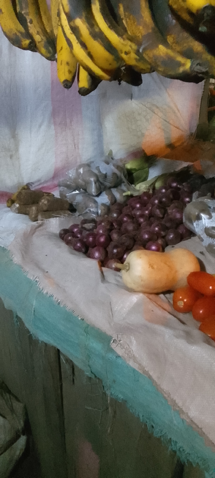 A display of fruits and vegetables includes overripe bananas hanging above a surface covered with a variety of items. Brown root vegetables are to the left, with plastic bags containing unknown items scattered nearby. A pile of red onions dominates the center, next to a small butternut squash. A cluster of red tomatoes sits on the right edge of the display, all resting on a weathered, light-colored surface with a green trim.
