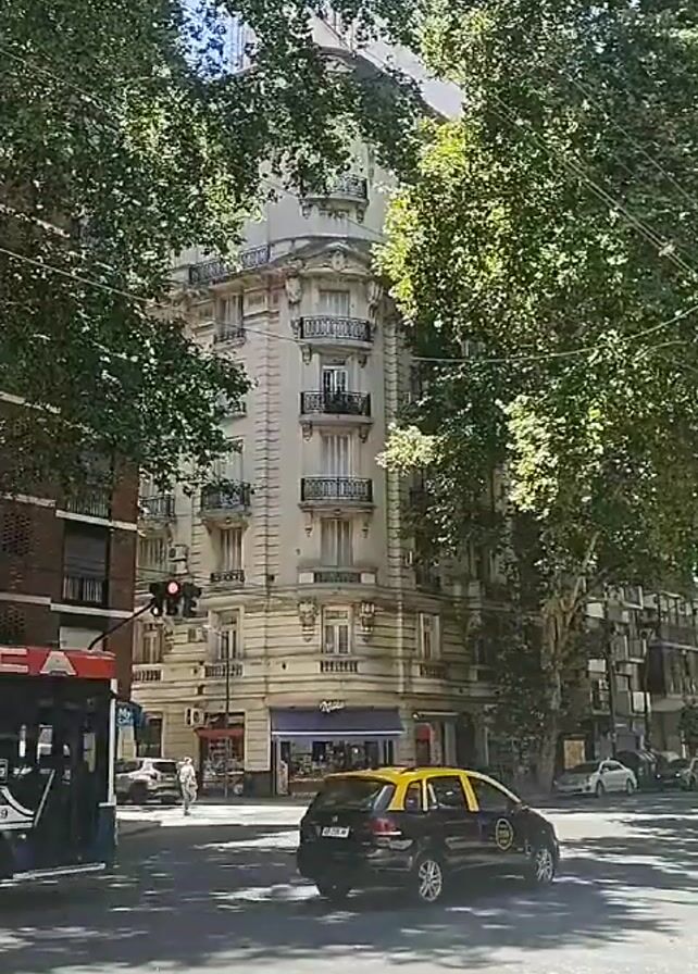 A daytime shot captures a street scene, featuring a classic corner building in Argentina, framed by the green foliage of tall trees