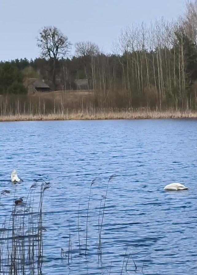 body of water, possibly a lake, with two white swans floating on the surface. Some tall reeds or grasses grow near the edge of the water in the foreground. On the opposite shore, there is a grassy area with trees and a couple of small buildings in the background. The sky is overcast and gray.