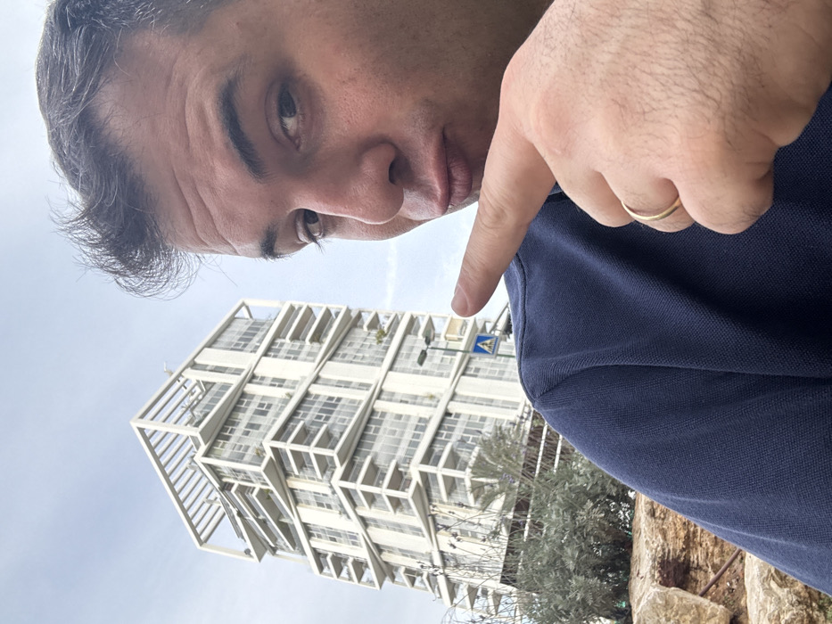 An outdoor photograph captured at a low angle features a male subject occupying the right half of the frame, with a modern high-rise building in the background. The man, with short dark hair, looks directly at the camera with slightly pursed lips. He wears a dark blue polo shirt. His right index finger is extended, pointing towards the left side of the frame. A plain gold band is present on his left ring finger. The prominent background element is a tall, white, multi-story residential building identified as the Arlozorov 17 Tower (Gindi TLV Arlozorov Tower), located at 17 Arlozorov Street in Tel Aviv, Israel. This building features numerous staggered balconies with white railings and extensive glass windows, topped with a distinctive open white lattice structure. Below the tower, a street lamp with a blue and white pedestrian crossing sign (indicating an A-shaped figure) is visible. Sparse green and gray shrubbery, along with a palm tree, are situated in the mid-ground. The lower-left foreground shows rocky landscaping. The sky overhead is light blue with minimal cloud cover.