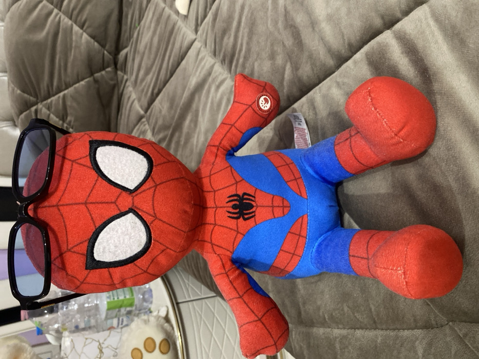 The scene is located in Kozloduy, Bulgaria. A plush Spider-Man toy is sitting on a grey, quilted, upholstered surface. The toy is predominantly red and blue, featuring black web-like patterns on its red sections and a black spider emblem centrally located on its chest. Its head is red with white felt eyes outlined in black. Black-framed 3D glasses are resting on top of the toy's head. A small, circular red patch with a white handprint symbol is visible on the outer side of the toy's right arm, above the wrist. A white manufacturer or care tag is partially visible near the toy's right hip. In the background to the left, a light-colored cabinet or table holds two clear plastic water bottles and a partially visible white, spotted plush object.