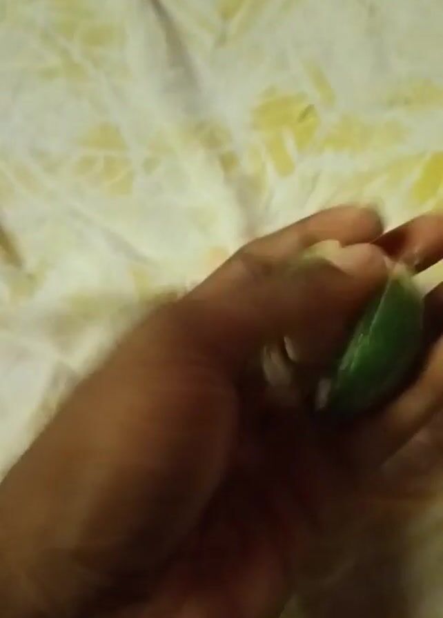 A hand is holding a halved fruit with green skin and a white pit. The background is a white and yellow patterned surface, likely a bedspread.