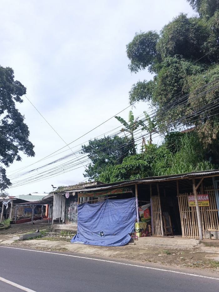 A row of small roadside shops with corrugated metal roofs lines a paved road. The shops have various states of occupancy and construction, with one covered by a large blue tarp. Overhead, a dense network of power lines crisscrosses the sky, obscured in places by lush greenery. Bamboo thickets and tall trees grow beyond the buildings. The sky is overcast, casting a soft light over the scene.