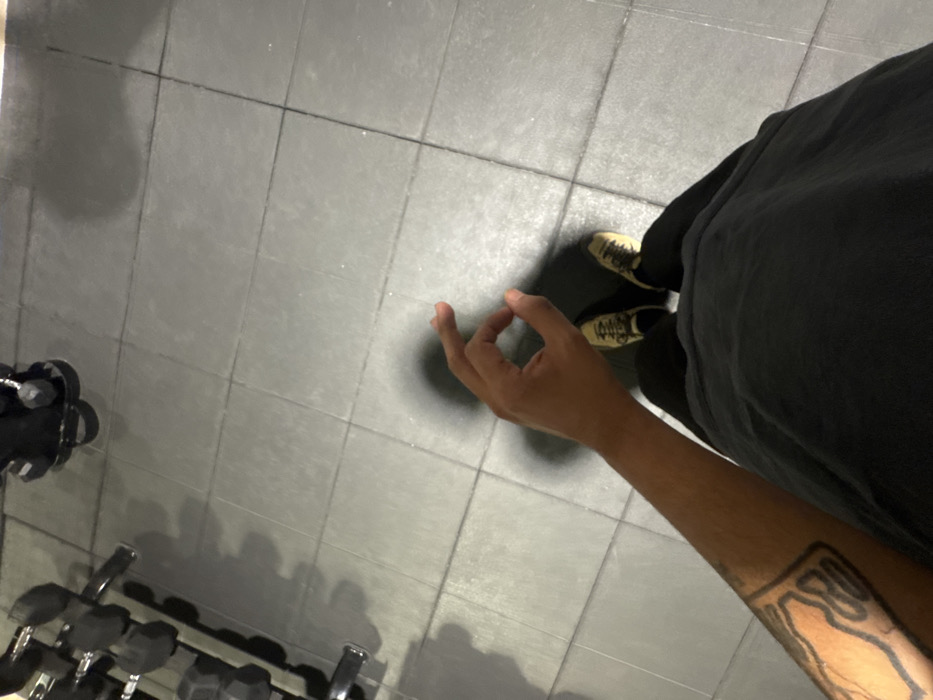person standing on a gray tiled floor, possibly in a gym. Their hand is visible, with fingers slightly bent. They are wearing black pants and tan shoes with a pattern. A portion of their arm is visible, featuring a large tattoo. In the background, a rack of dumbbells is partially visible on the left side.