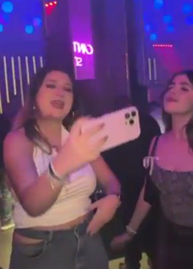 two women enjoying themselves at a club with flashing lights and loud music. The woman on the left wears a white halter top, blue jeans with cutouts, and a bracelet, and she is recording with her iPhone, dancing, and smiling. The woman on the right wears a grey top with a black camisole underneath and black pants. Other people are visible in the background. The club has red and blue lighting.