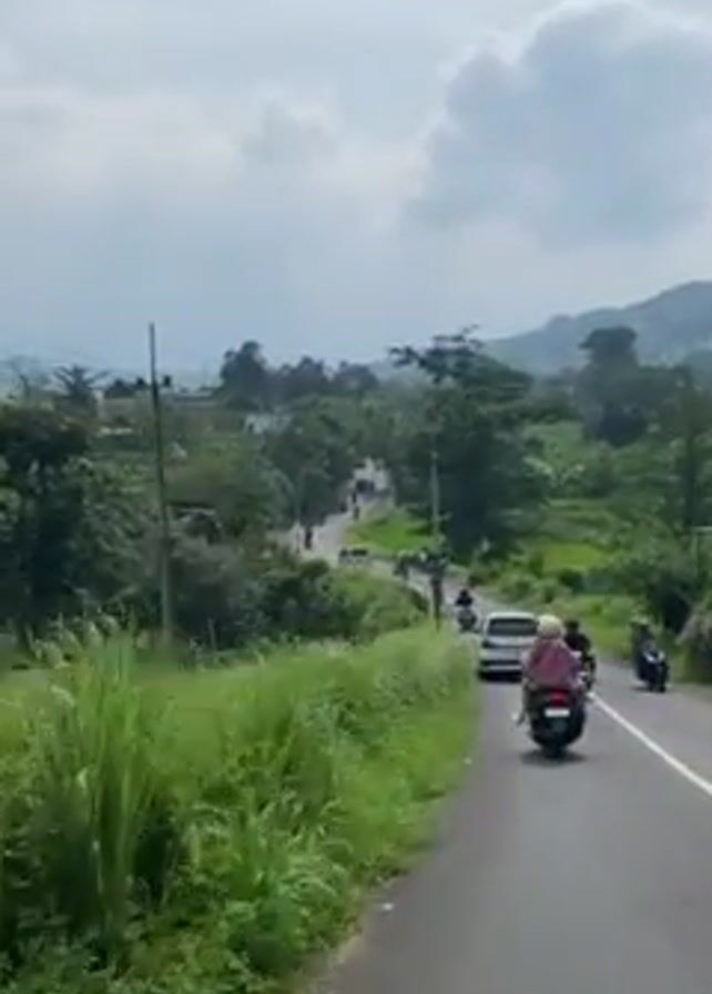 slightly elevated view of a road in a rural or semi-rural area. The road is paved and has a white line marking the edge. A white car and a motor scooter with two riders are traveling on the road in the same direction as the camera. Lush green vegetation, including tall grasses, lines the side of the road. In the distance, there are more vehicles and people, and a backdrop of green hills and trees under a cloudy sky. Utility poles with wires run along the side of the road.