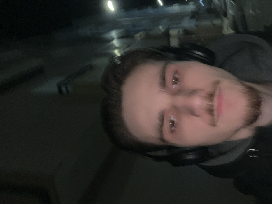 A selfie shows a man with brown hair, a mustache, and a short beard. He's wearing headphones and a hooded sweatshirt. The background is blurry and dark, suggesting an outdoor or dimly lit environment. Some vague shapes and light sources can be discerned in the background. The man's face is the main focus, with a slightly tilted angle. The overall tone is casual.