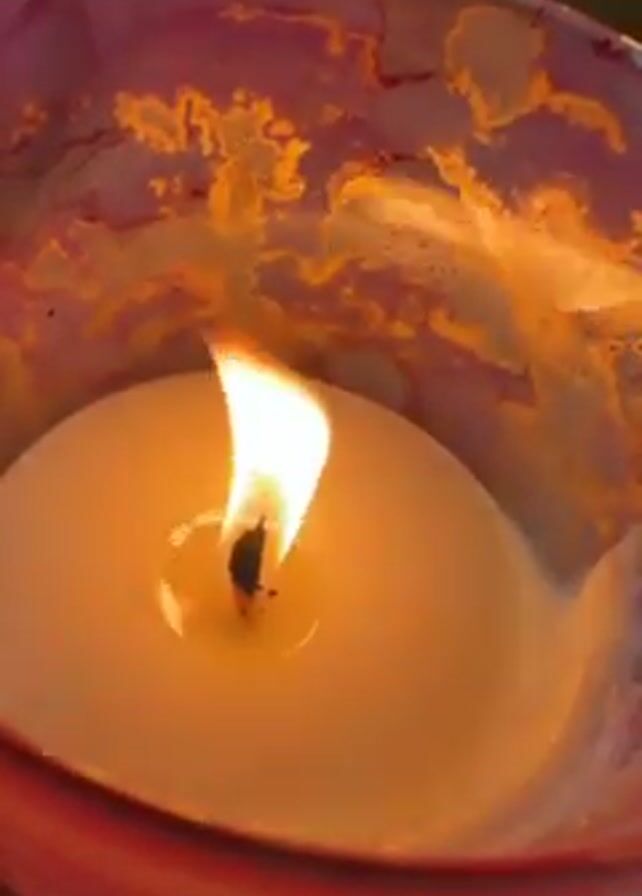A close-up shot shows a lit candle inside a pink and white marble-patterned glass container