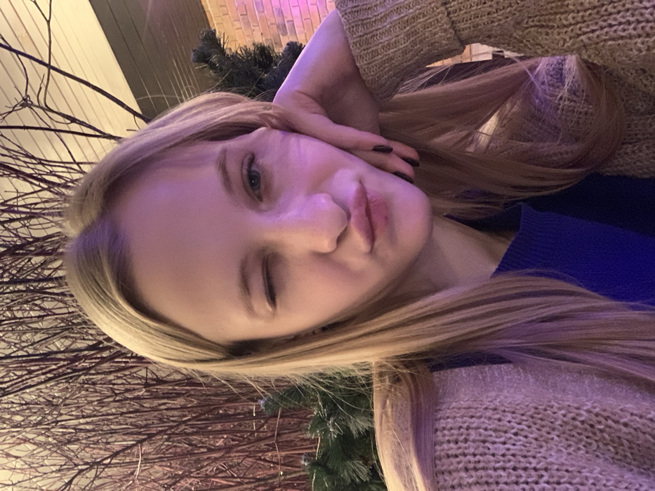 A blonde woman with light skin winks at the camera. She wears a blue shirt and a knitted sweater. Her hand is near her face. The background includes decorative branches and what appears to be a brick wall. The image is slightly tilted. Black nail polish is visible on the hand near her face.