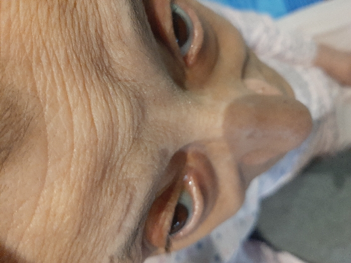 The scene is located in the city of Barza Municipality, Syria. The image captures a high-angle, close-up perspective of an individual's upper face. The subject, likely an adult, exhibits numerous prominent horizontal wrinkles across the forehead and a discernible nose. Both brown eyes are open and directed downwards. Portions of light-colored, possibly patterned, clothing are visible below the chin and around the neck area. The immediate background is out of focus, displaying indistinct areas of light blue and darker tones, providing no further specific environmental context. No explicit actions beyond the downward gaze are discernible, and no interactions are visible.