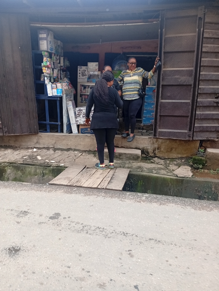 The image displays a street-level scene in Onitsha, Nigeria, featuring a retail shop entrance and three adult females