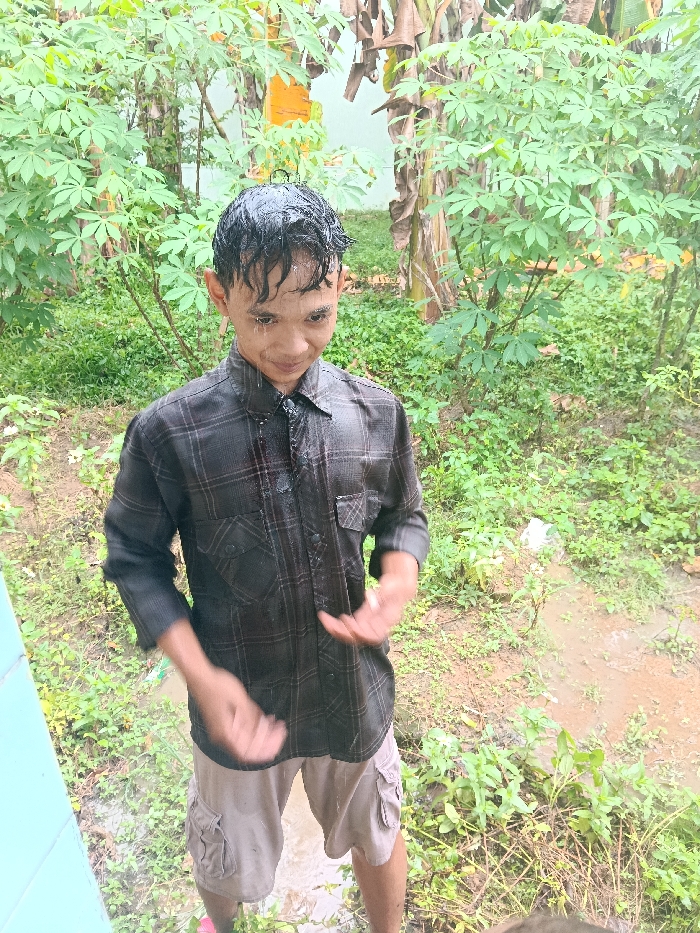 A young man stands in a lush, green outdoor setting, drenched with water. He wears a dark, plaid button-up shirt and khaki shorts. His hair is soaking wet, and water streams down his face. The background shows various plants, shrubs, and a muddy ground, indicating recent rainfall. He holds his hands out, as if catching raindrops, with a slight smile on his face, adding to the sense of youthful enjoyment in the midst of the downpour.