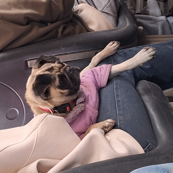 A pug lies comfortably, wearing a pink coat with a fur collar and a red collar with a black buckle. It's positioned between a beige cloth and jeans, with its arms stretched out. The dog is inside a vehicle with a gray interior. A circular vent is visible on the left, and additional fabrics are piled in the background. The pug appears relaxed and at ease.