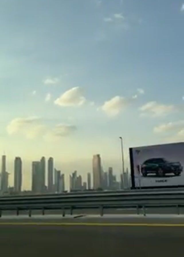 view from a moving vehicle on a highway, capturing the skyline of Dubai
