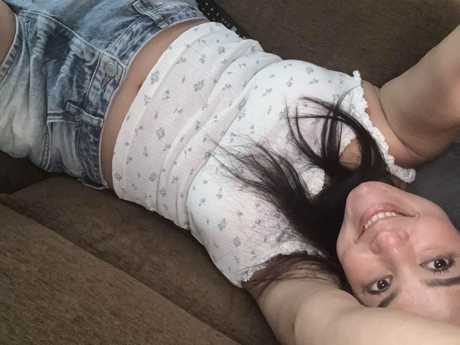 The scene is an indoor setting, identified as being in the city of Burjassot, Spain. A female individual is positioned supine on a light brown, textured fabric sofa, with her body oriented diagonally across the frame. She is wearing a white strapless or tube top with small blue floral patterns and light-wash denim shorts. A section of her midriff is exposed between her top and shorts. Her long, dark hair is fanned out around her head. Her face is turned directly towards the camera, displaying an open-mouth smile with visible teeth. Her eyes are open, with dark eyebrows and visible mascara on her lashes. Her lips appear glossy. A dark, rectangular object, consistent with an electronic remote control, is partially visible on the sofa near her left hip (viewer's right). The individual is looking at the camera and smiling.