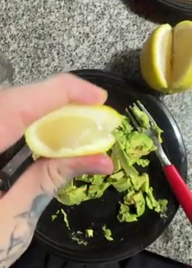 A person is squeezing a half of a lemon on a plate of chopped avocados. The plate is black and a red-handled fork rests on the plate as well. Another half of the lemon sits on the granite countertop next to the plate. A second plate with food residue is visible in the background. The person squeezing the lemon has tattooed hands, and is wearing black pants and a pink shirt.