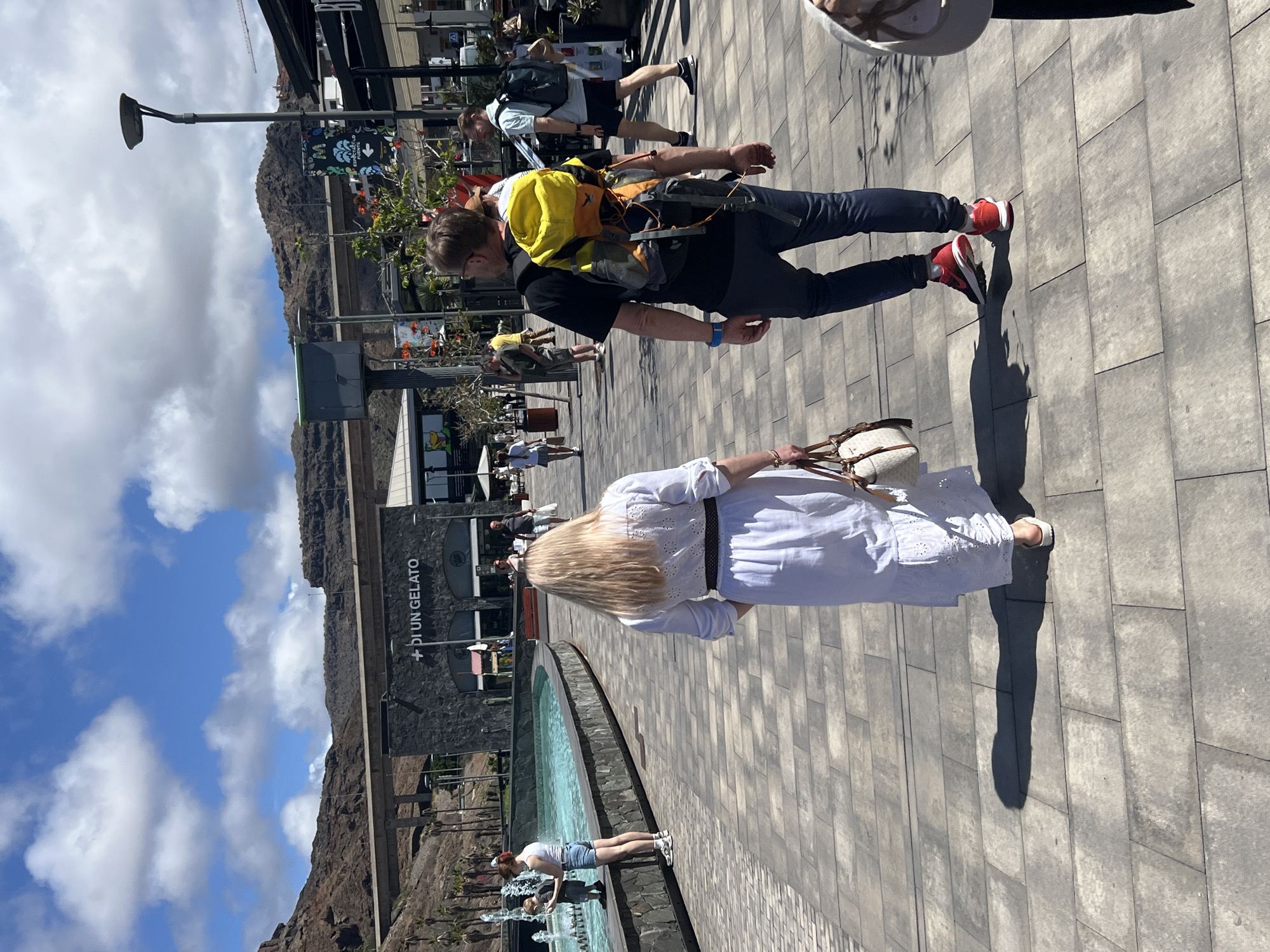 The scene depicts an outdoor pedestrian area within a commercial complex in El Chaparral, Spain, under a partly cloudy blue sky. The ground is paved with rectangular light grey stones. In the immediate foreground, a blonde woman, seen from the back, wears a long white embroidered dress with a dark belt and white sandals, carrying a light-colored handbag. To her right, a man, also viewed from the back, wears a black t-shirt, dark trousers, red and white athletic shoes, a blue wristband, glasses, and a yellow, orange, and grey hiking backpack. Both are walking away from the viewer. To the left, a curved, stone-edged fountain with light blue water features active jets. A woman with reddish-brown hair in a white tank top and denim shorts stands by the fountain, accompanied by a young boy in a light shirt and shorts who observes the water. In the mid-ground, a building with dark, textured cladding displays prominent signage reading "+ DI UN GELATO" above arched glass doorways. To the right of this building, additional commercial establishments with dark awnings are visible, along with a grey lamppost and a vertical banner featuring colorful graphics and the text "ESPECTÁCULO FUENTE" (Fountain Show). Red benches are partially visible near the main building. The background is dominated by arid, rocky, brown mountains. A concrete bridge structure traverses horizontally across the middle distance, partially obscuring the mountain base. Several other pedestrians are present throughout the complex, walking in various directions.