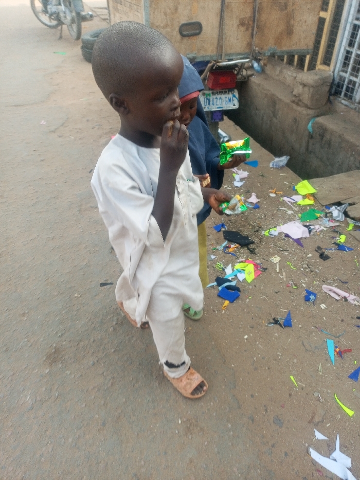 Two young children are depicted outdoors in Pantame, Nigeria. In the foreground, a child with dark skin and a shaved head wears a light-colored, long-sleeved tunic and matching trousers with brown open-toe sandals. This child is observed with their right hand at their mouth, appearing to eat. Partially visible behind and to the right of the first child is a second child, also with dark skin, wearing a blue head covering and light green open-toe sandals. This second child holds two green, rectangular packages; one appears to be open, the other sealed. The ground surface consists of a paved or hard-packed dirt area. Scattered across the ground, particularly to the children's right, are numerous small, irregularly shaped pieces of colorful fabric or material. In the background to the left, a portion of a motorcycle, including a tire, is visible. To the right, a building structure with a concrete or mud-brick ledge and a metal grate or window frame is present. A purple Nigerian license plate, "UN 420 GME," is visible on a vehicle part behind the children.