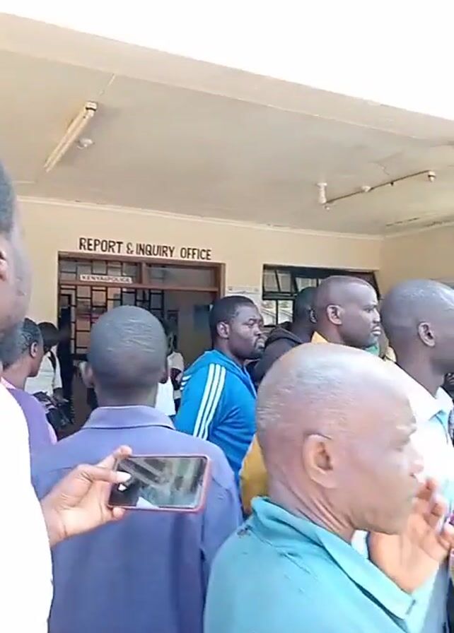 A crowd of people are gathered outside a building, partially obscured by trees, with a sign above the entrance that reads "REPORT & INQUIRY OFFICE KENYAPOLICE