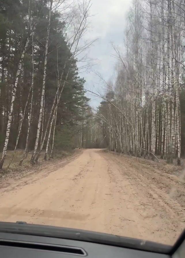 The video depicts a vehicle driving along a dirt road through a forest. The road is flanked by trees, mostly birch on the right and a mix of birch and evergreen on the left. The sky is overcast. The vehicle is moving forward, and the view is from the driver's perspective. There are no other discernible people, objects, or interactions visible in the frame.