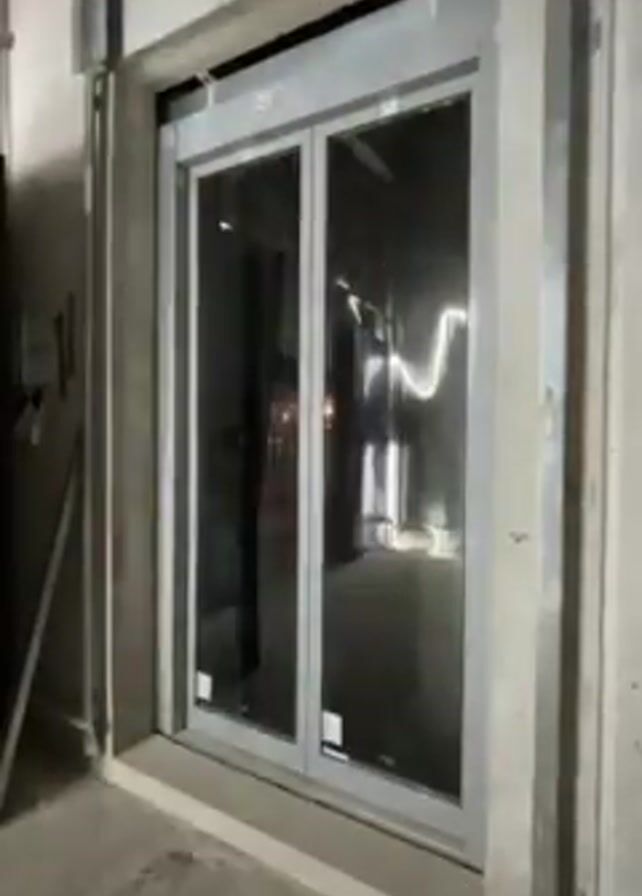 n elevator with doors that appear to be made of glass or a transparent material. The doors are closed. The elevator shaft and surrounding area are in an unfinished state, with exposed metal framework and concrete. There is some equipment visible in the background of the elevator cab. The camera appears to be stationary.