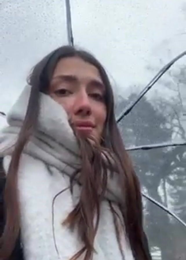 A young woman with long brown hair and a thick, light-colored scarf wrapped around her neck holds a clear umbrella in the rain