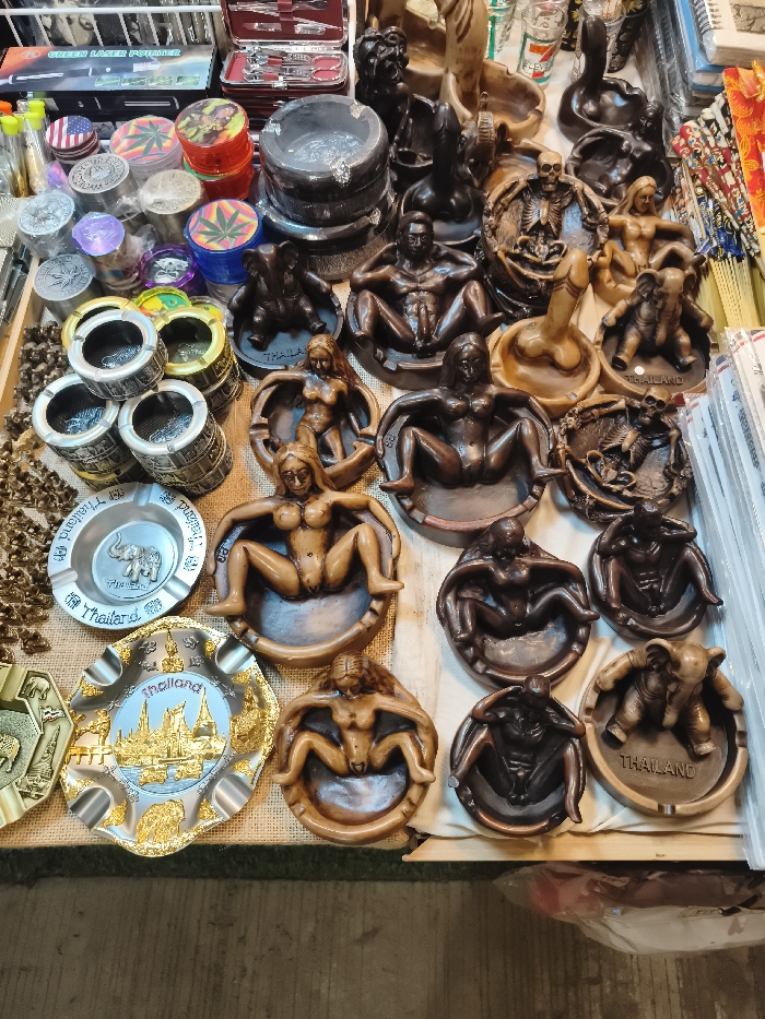 This image depicts a market stall displaying a variety of novelty items and souvenirs in Baan Chaweng, Thailand. The items are arranged on a light-colored, woven mat, likely jute or burlap, covering a wooden surface. The primary objects are numerous ashtrays or small trinket dishes made from various materials. A significant portion of these are dark, resin-like castings featuring explicit and erotic human figures. These include multiple male and female figures in squatting or reclining poses, often with exposed genitalia, some appearing to be in sexual acts. One notable piece is a phallus-shaped ashtray. Other themed ashtrays include a skeleton figure, several elephant figures with "Thailand" inscribed, and decorative metal plates depicting Thai temples and elephants, also bearing "Thailand" text. A stack of silver-colored, circular metal ashtrays is visible on the left. In the upper left quadrant, various small cylindrical items are displayed. These include brightly colored grinders, some adorned with cannabis leaf designs, others with a US flag motif. Small clear tubes and bottles are also present. Further back, a red-cased manicure or tool set is visible, alongside a box labeled "GREEN LASER POINTER." The background shows additional indistinct merchandise, suggesting a dense display typical of a market environment. There are no people visible in the frame, and the items are static, arranged for sale.