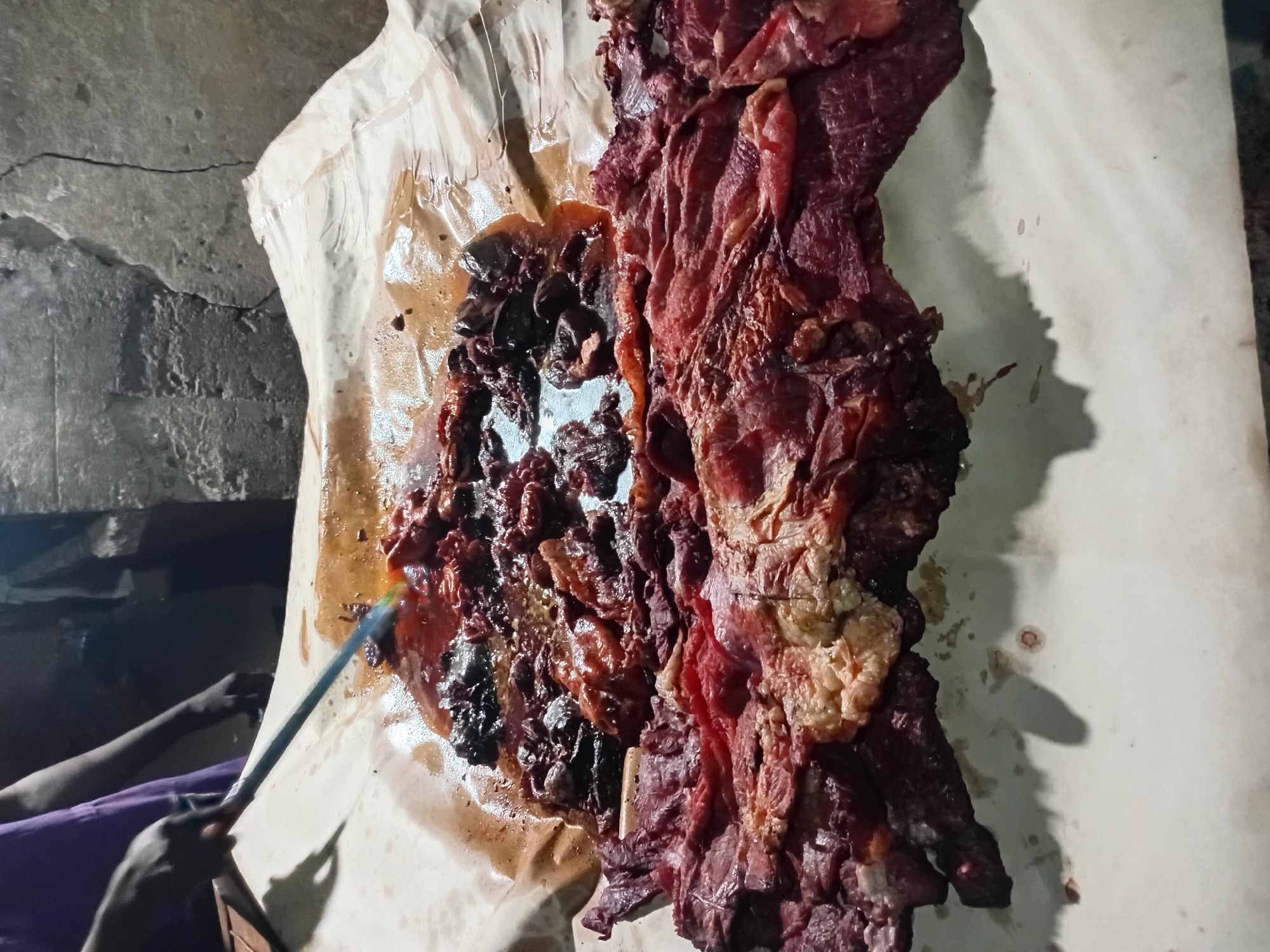 A large section of raw meat, likely beef, is laid out on a piece of white paper or cloth