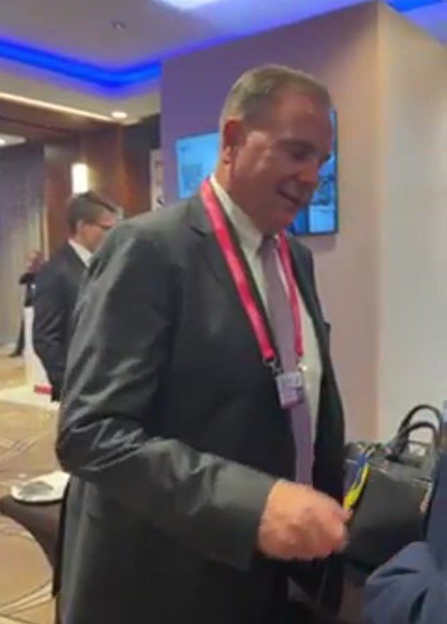 A man wearing a suit and a conference lanyard is looking at something in his hand. He then turns and greets another man in a suit, placing his hand on the other man's shoulder. The setting appears to be a conference or meeting, based on the decor, other people in suits, and the presence of a television on the wall.
