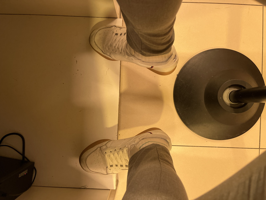 A high-angle shot captures two feet in white sneakers and gray denim jeans, positioned on a light-colored tiled floor. A black round base of a pole is visible to the right of the feet. To the left, a black object with a handle sits on a white surface, bordering the tiled floor. The overall lighting casts warm shadows, emphasizing textures and shapes.