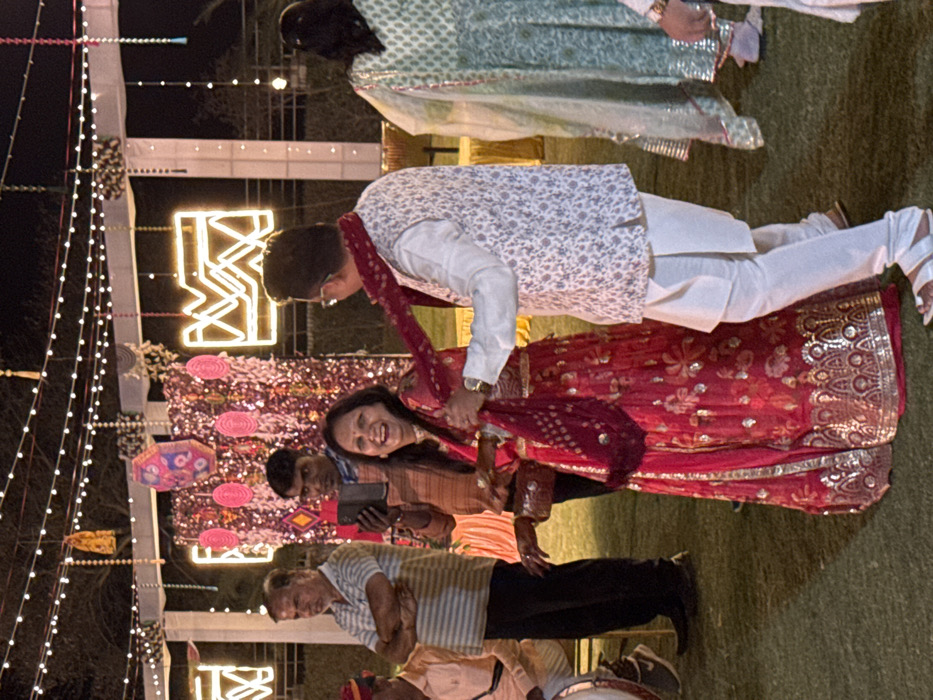 A group of people gather at an outdoor event at night. String lights hang in the background. A man in a white outfit and patterned vest stands next to a woman in a red and gold sari. Both are smiling. Several other people are positioned near them, one holding a phone. The event appears to be festive and celebratory.