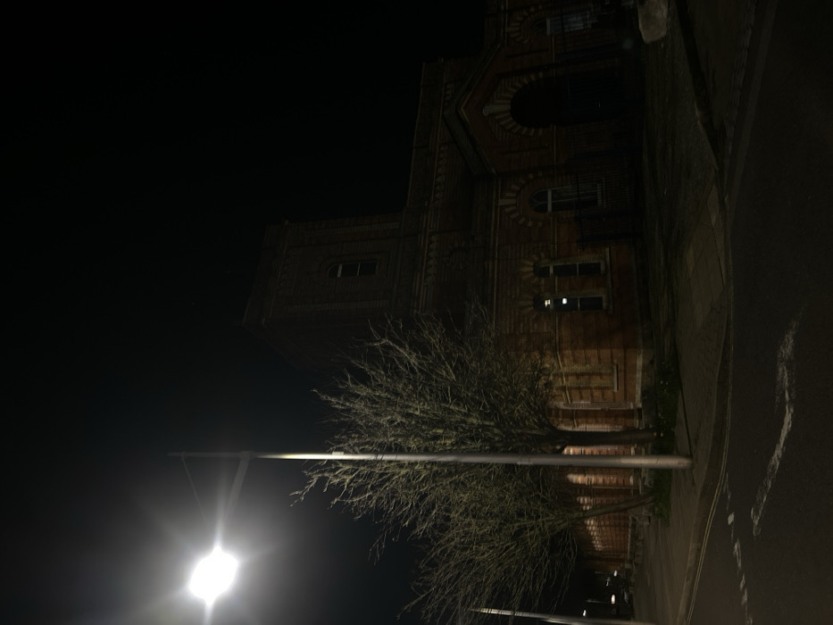 The scene presents an exterior view of the Gillingham Pumping Station, located on Pier Road in Gillingham, United Kingdom, captured during nighttime. The primary subject is a multi-story building constructed of red-brown brick with lighter-toned stone or brick architectural detailing, including arched window surrounds and cornices. A square tower rises from the left side of the structure. Multiple arched windows are visible across the facade, with some containing internal light sources. A large, dark archway, likely a main entrance, is positioned on the right side of the building, fronted by dark metal fencing. A tall, grey streetlamp with a bright white light source occupies the left-center foreground, casting illumination onto a group of deciduous trees with bare branches situated between the lamp and the building. The foreground consists of a dark asphalt road with partially visible white road markings and a grey paved sidewalk running parallel to the building. The sky is uniformly dark. No persons, vehicles, or observable activities are present within the frame.