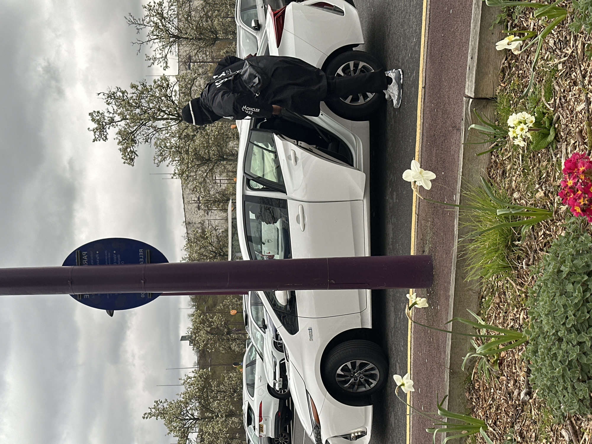 The image depicts a street scene in Dartford, United Kingdom. A row of parked white cars lines the side of the road, with a person in black outerwear with the word "MONCLER" visible getting into one of the vehicles. A signpost stands nearby, bearing informational text in English. Adjacent to the parked cars is a strip of ground cover with various flowers planted, including white daffodils and red primroses. The background reveals trees with white blossoms against an overcast sky.