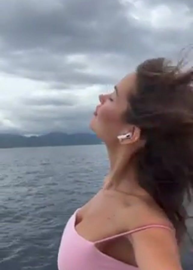 A young woman with brown hair stands on a boat wearing a pink crop top. She is facing the camera and smiles. The sky is cloudy and there is water and distant land in the background. She tips her head back and looks at the sky. The wind is blowing her hair.